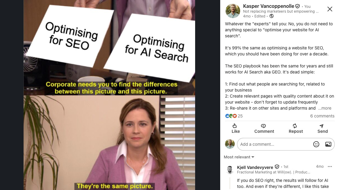 Ok so here’s my actual position: Good content matters in both. Trust signals matter in both. Answering real questions matters in both.
