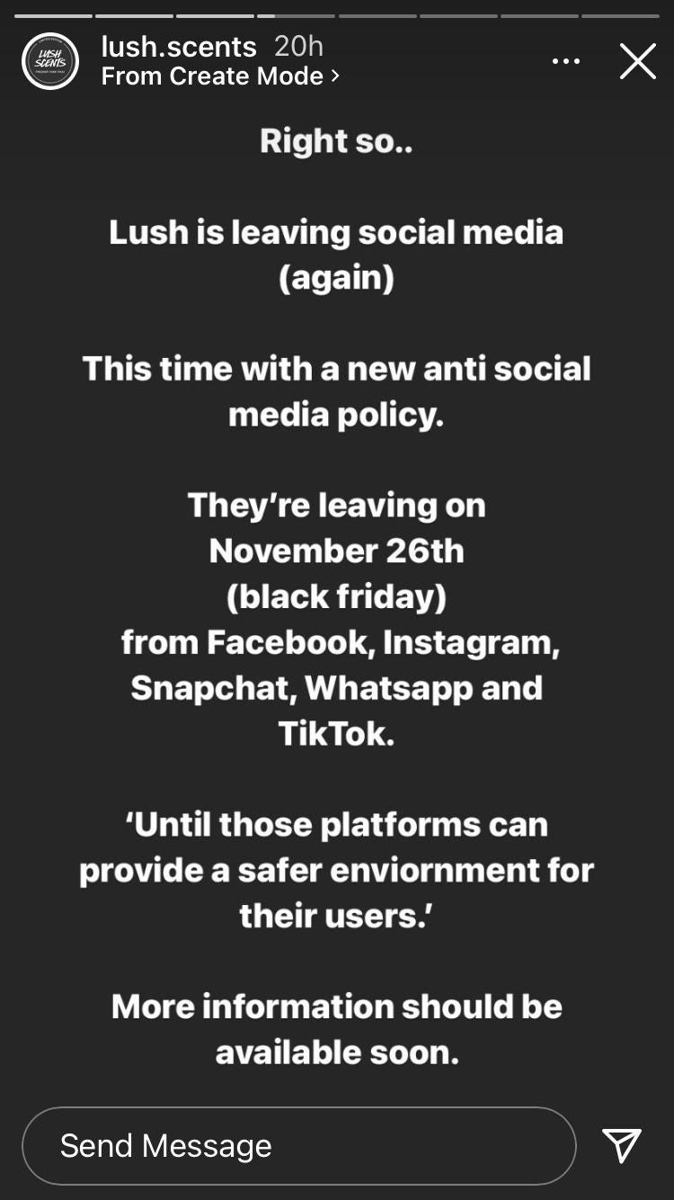 Lush Cosmetics went further. They quit social media entirely: Meta, TikTok, all of it. To create what they call a “walled garden” of safer community. Instead of algorithmic reach, they invested in physical events and creator partnerships.