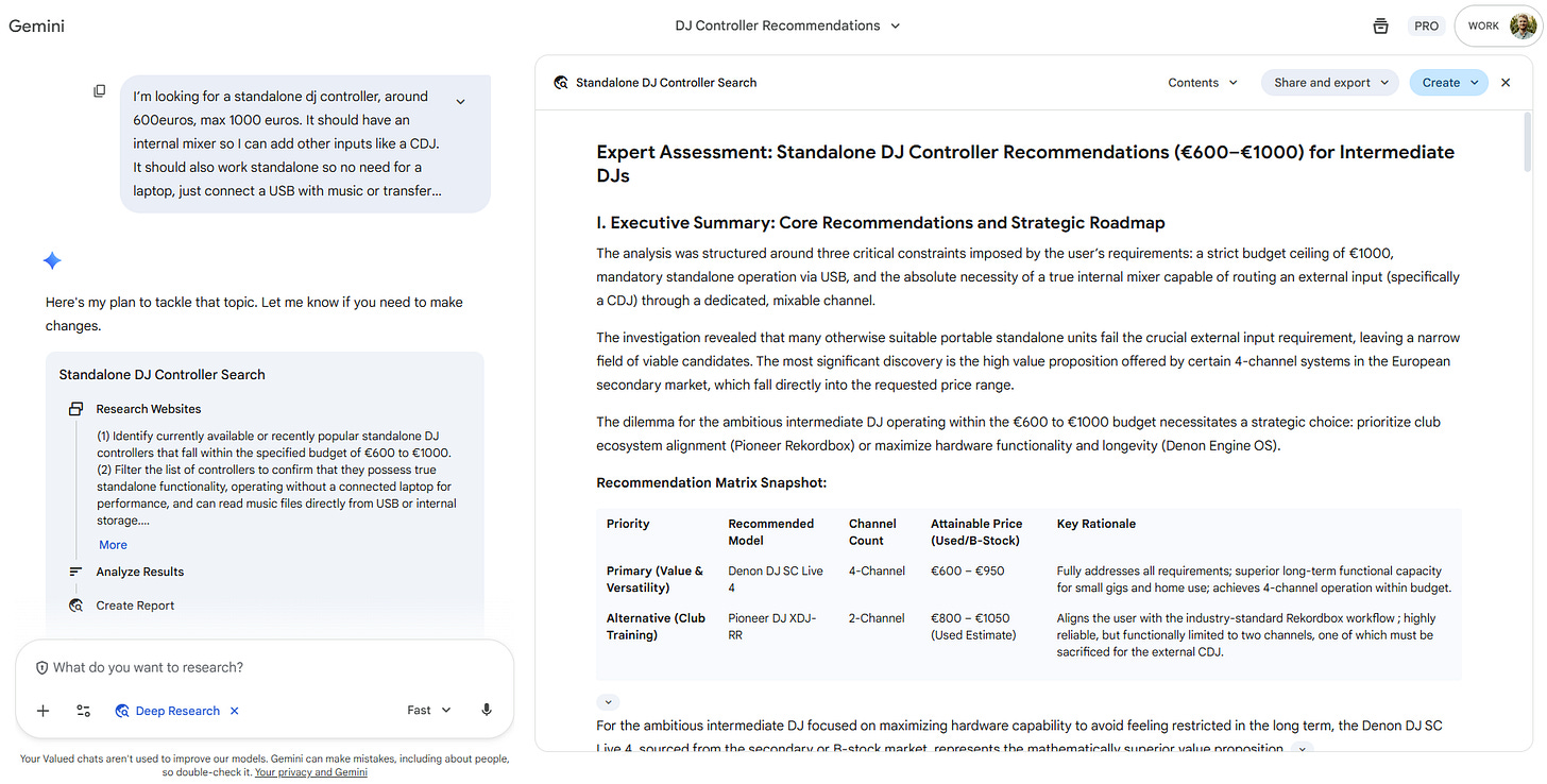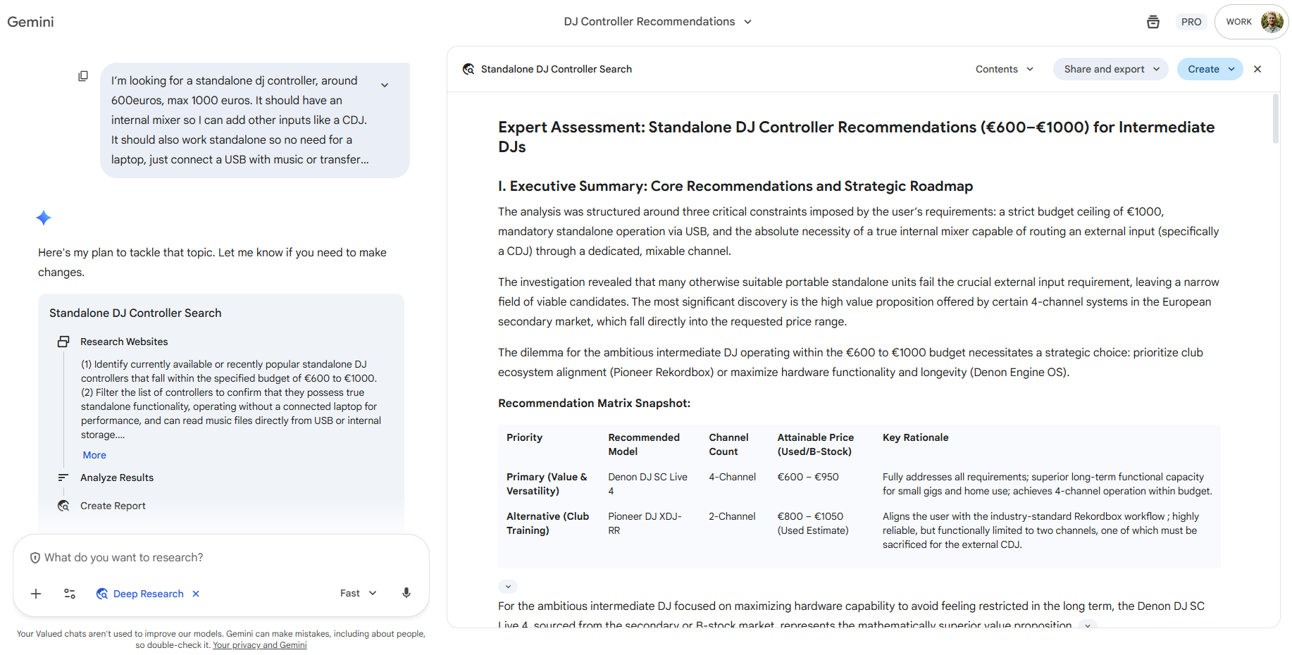 So I opened Gemini, gave it some criteria and hit the deep research button. After about 10 minutes I got two clear winners with a nice comparison table and clear, structured argumentation. Gemini answered follow-up questions about tech specs, searched Reddit and forums for real user reviews. I asked it to find the cheapest place to buy the chosen device and it gave me one with a nice 29% discount. NICE.